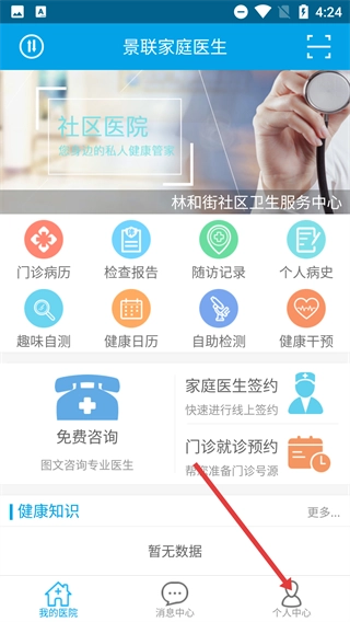 1、在景联家庭医生首页找到右下角的【个人中心】按钮并点击,即可进入个人中心页面。