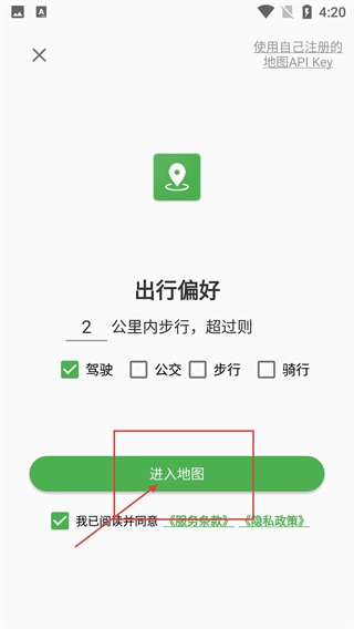 进入软件后,首先设置【出行偏好】,勾选同意协议并点击【进入地图】,就能进入主界面。