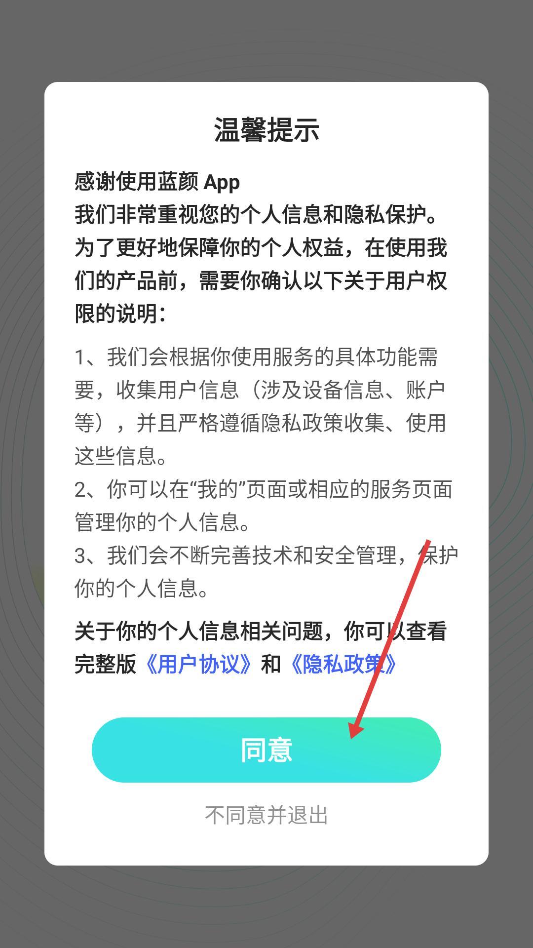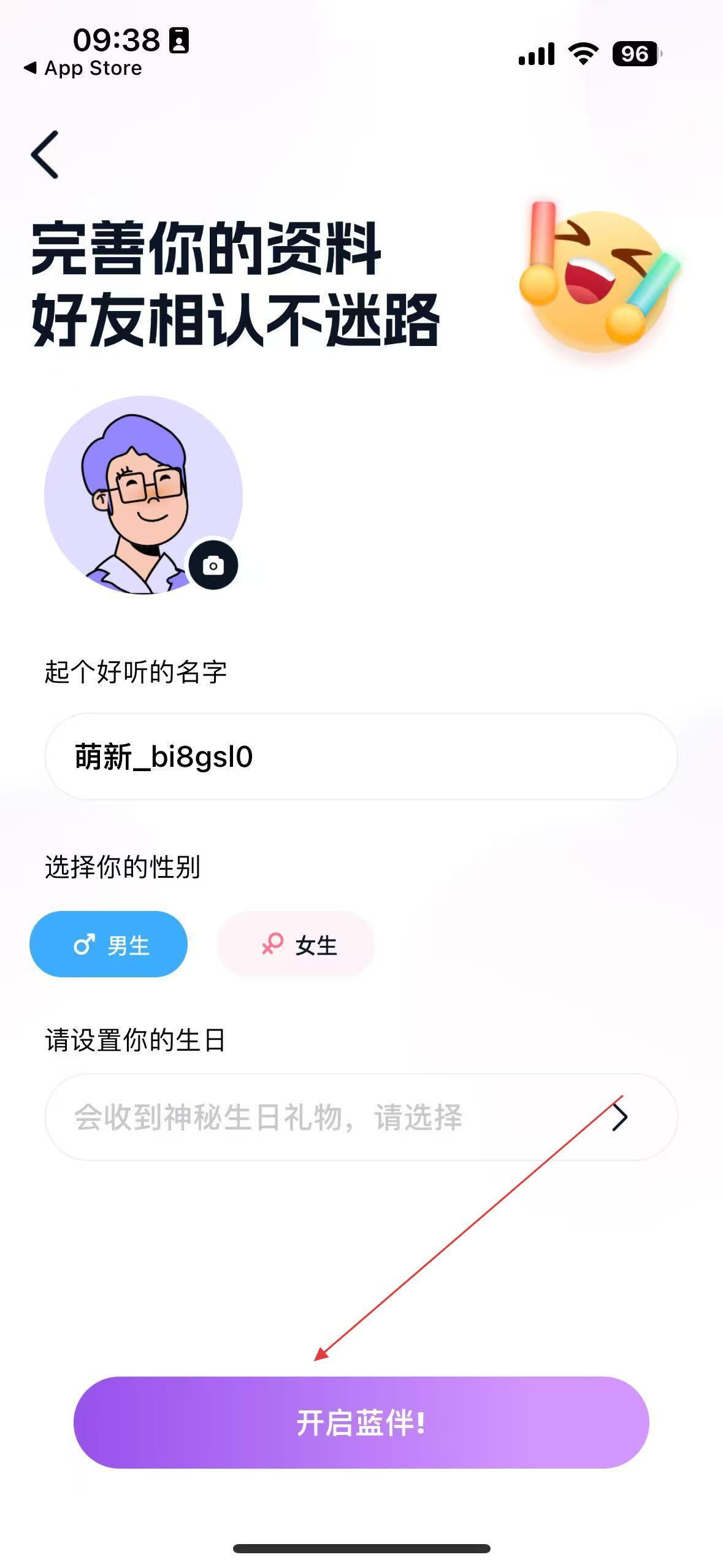 1、打开蓝颜App,点击同意相关提示,进入资料页面后,完善昵称、性别、生日等信息,接着点击开启蓝伴,即可开启社交功能。