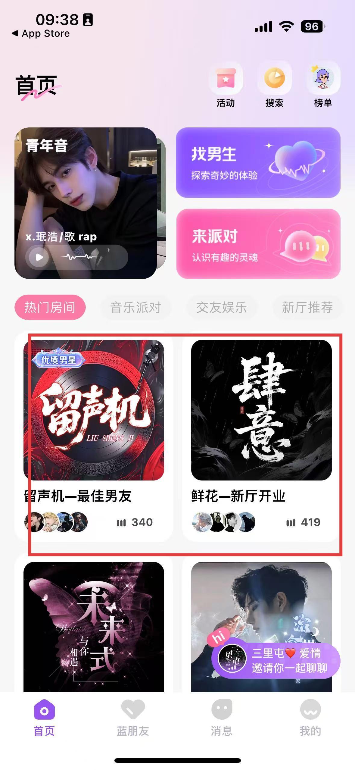 3、进入首页后,点击热门房间,进入留声机、肆意等厅,通过互动交流,参与音乐派对、交友娱乐等活动,以此拓展社交圈。