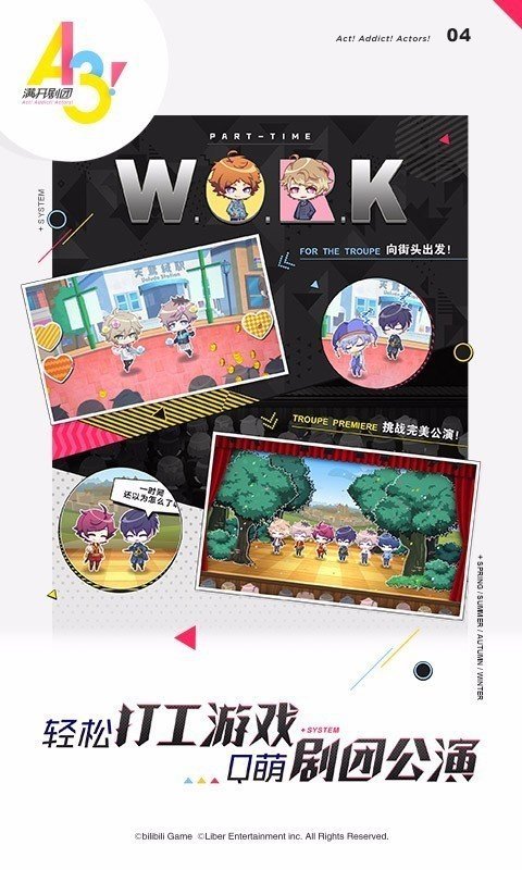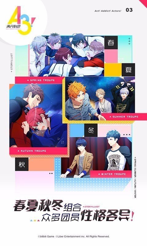 玩家将在游戏中成为剧团的团长兼总监督,召集帅气团员来拯救面临倒闭的剧团。通过搭配春、夏、秋、冬四个不同组合的成员,培养处在萌芽状态的剧团团员,让他们在小剧场的舞台上绽放自己的风采!游戏拥有豪华的声优阵容,主线剧情更是采用全语音模式!