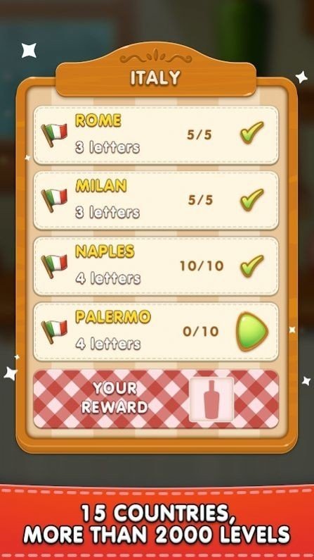 游戏完美融合了披萨美食和单词两种元素,非常有趣,玩家在游戏中需要将披萨上的各个字母进行拼凑连接,成为一个正确的单词,即可完成关卡。
