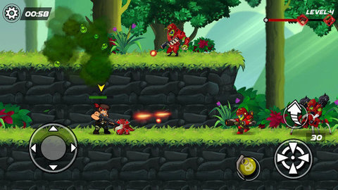 使用垫来回移动并点击以跳跃和射击。使用特殊的枪支和角色技能来击败外星人部队