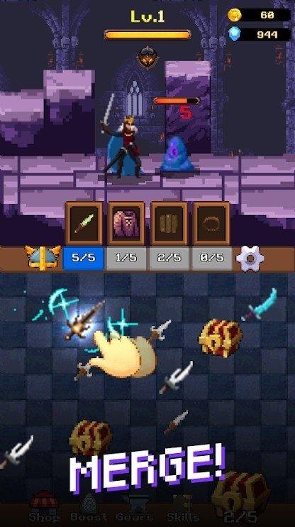 复古像素风合成闯关类玩法的游戏,以经典的战士形象亚瑟王为主角进行闯关挑战,游戏中无需玩家操作亚瑟王进行战斗,点击游戏内的宝箱生成亚瑟王战斗武器,两把相同品质的武器可以合成更高阶的武器。快来试试吧!点击下方就能下载了哦!