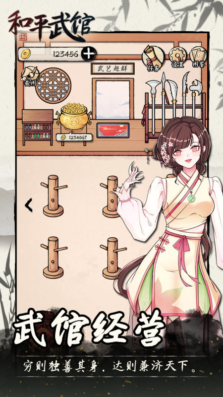 和平武馆是一款超级有意思的模拟游戏,屏幕前的你应该想到这款游戏的主要内容是什么了吧,没错!我们将会经营着一家武馆,不断的去帮助这些顾客提高它们的武术实力,在这过程当中是会收获到很多的游戏奖励的,只要自己的武术实力变得更高,想要来找你PK的玩家就会越多。