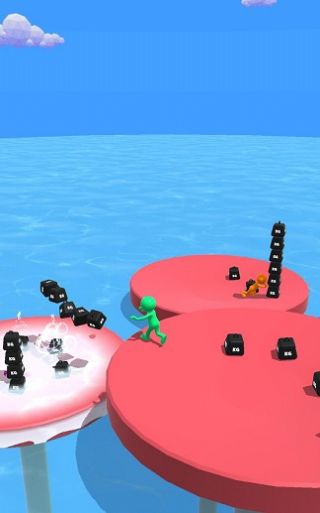 摇杆控制角色移动,通过收集台面上的铁块,然后将其丢在敌人的台子上面;