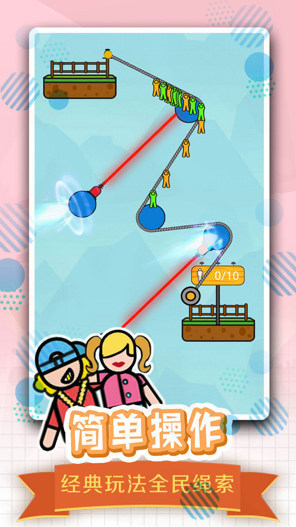 全民绳索营救老版本是一款手指控制的物理解谜休闲游戏。玩家需要通过手指画线来绘制绳索当然,画质清晰,就可以克服一个又一个关卡,全新的物理竞技的游戏玩法,更多的挑战体验乐趣的内容,挑战无限。