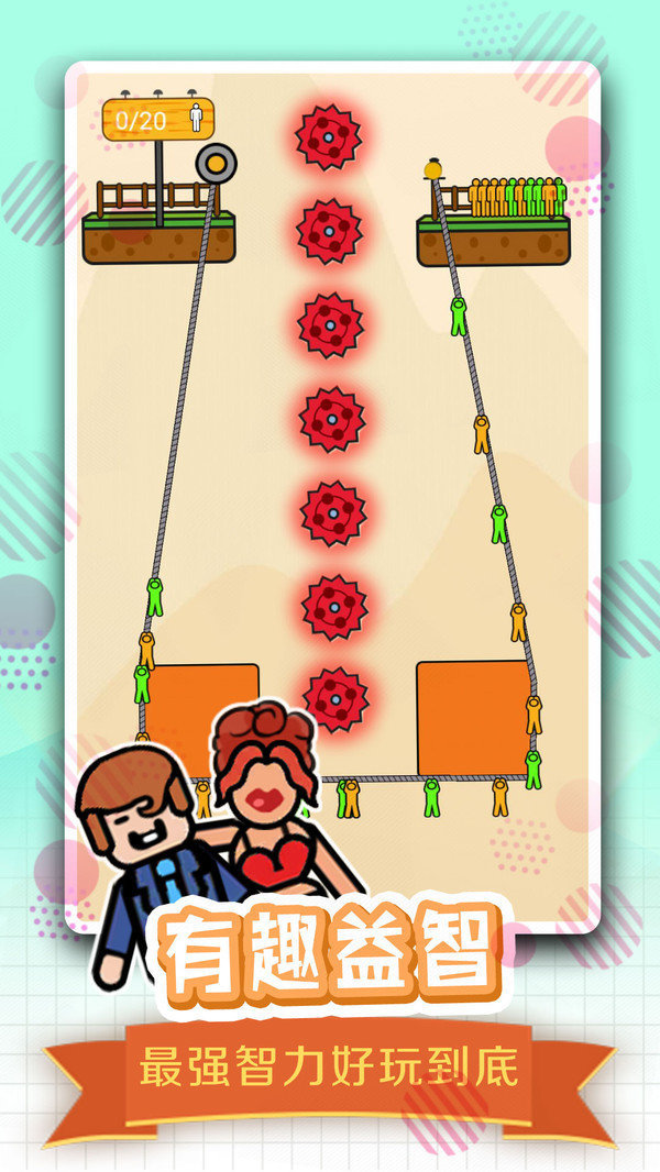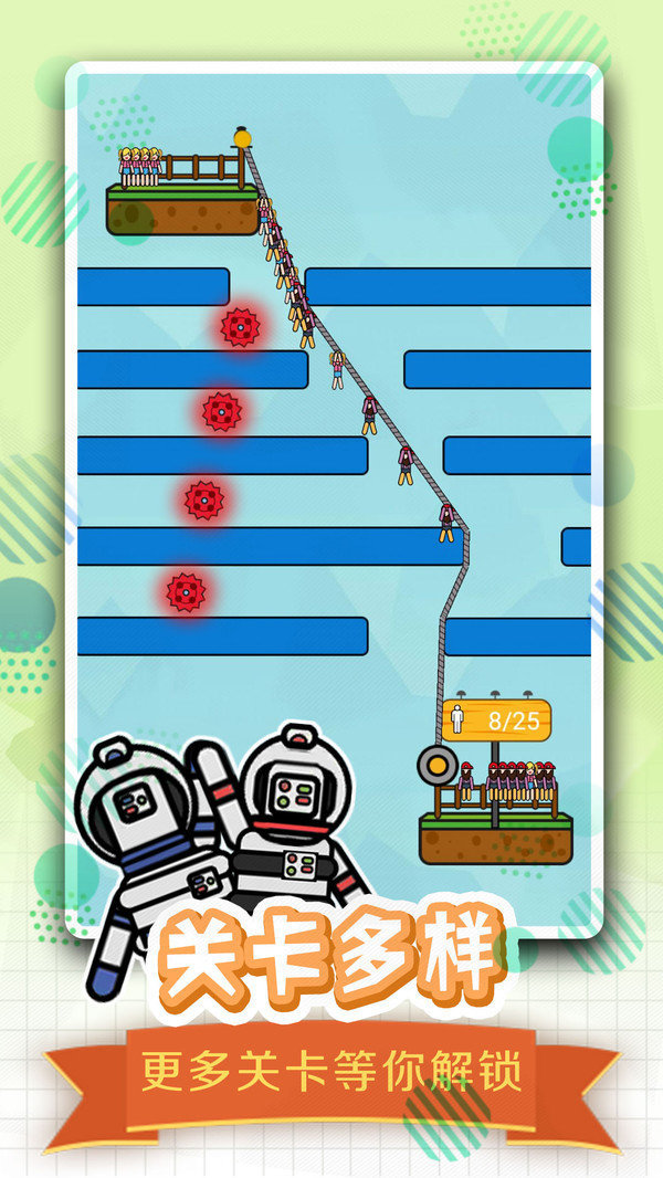 全民绳索营救老版本是一款非常好玩的休闲益智闯关游戏,玩家在游戏中操控自己的角色进行冒险,在各个关卡之中解救被困的角色,注意避开游戏中的障碍物,各种陷阱是注意细节的关键,用最安全的方式搭建绳索营救角色。