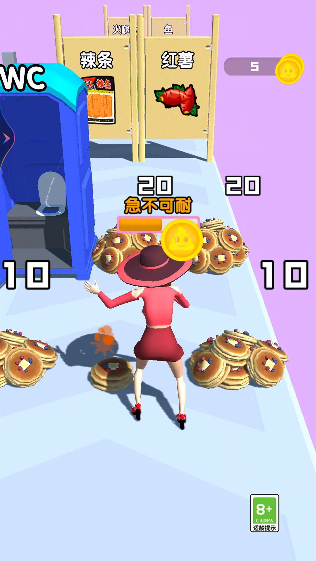 快去上厕所是一款很好玩的休闲游戏,游戏内的玩法相当有趣,你需要面对各种的美食诱惑,想办法算好相应的分数才可以闯关成功,这里的道路选择结果也是不同的,游戏过程非常考验玩家的反应力,在这里解决各种关卡难题,相当有挑战性,感兴趣的玩家赶紧来下载试试吧。