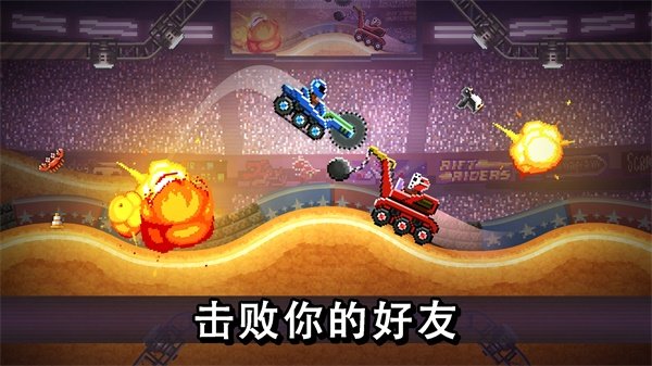 在竞技场上驾驶越野车、垃圾卡车和F1赛车。每种车辆都有自己的优胜劣势。游戏有三种模式:双人、单人,以及山丘之王比赛。在足球游戏模式中,你要用你的车粉碎巨大足球射门得分!