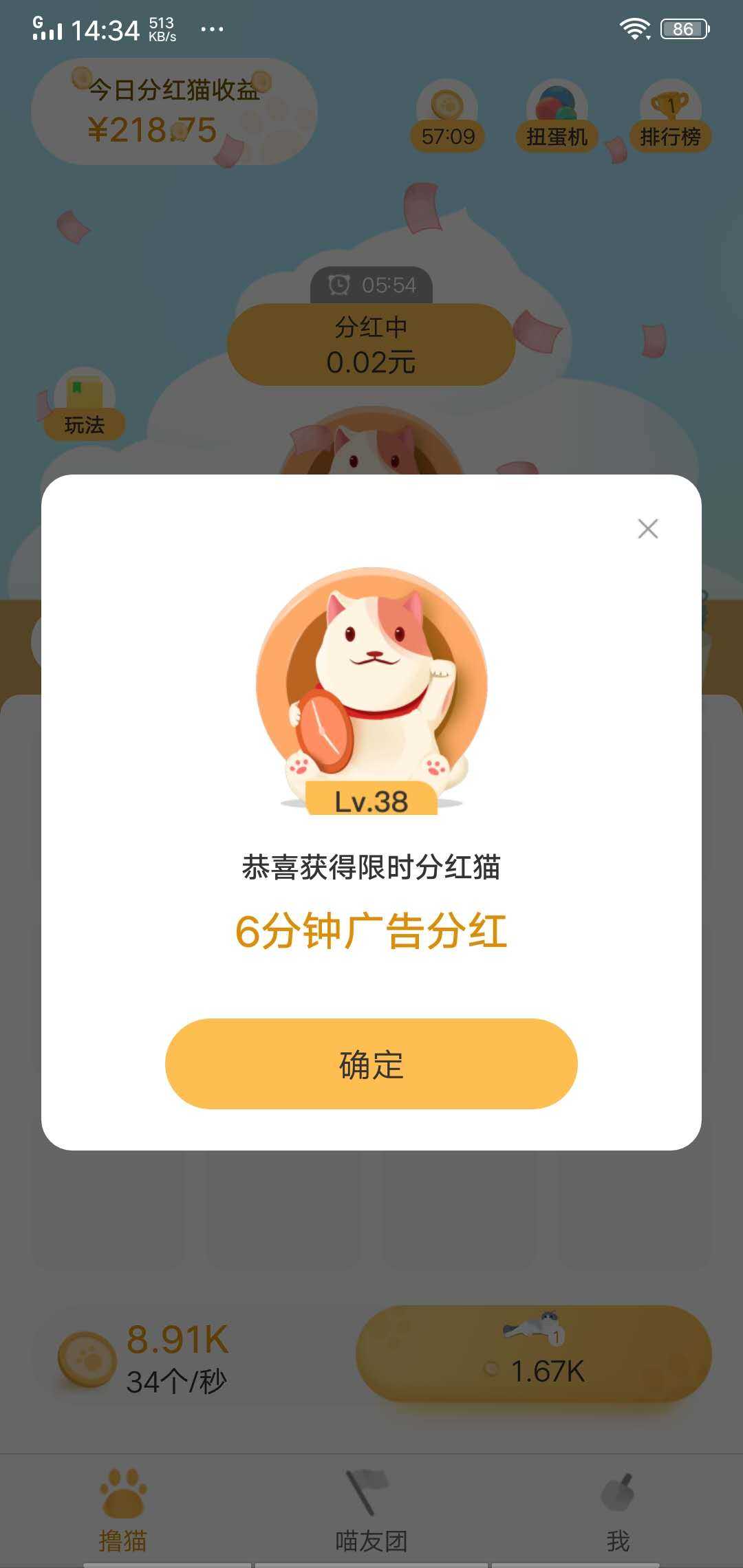 4、当两只37级猫合成38级时,有几率获得永久分红猫,赚218元/天