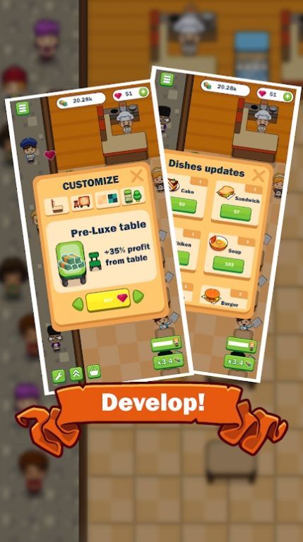 1、创新的模拟经营游戏,您将成为一位咖啡馆老板,自己开设咖啡馆,成为业界的领先者。