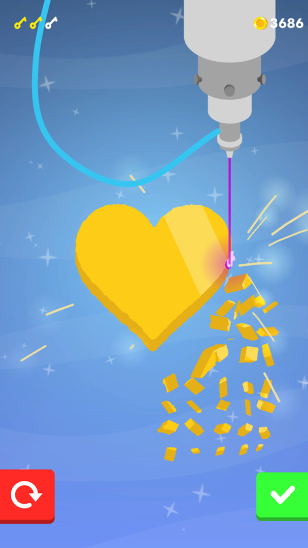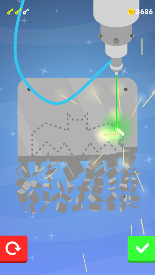 玩法操作十分的轻松简单,玩家们只需要通过点击屏幕的按钮就可以控制激光刀进行切割。