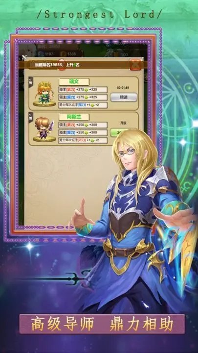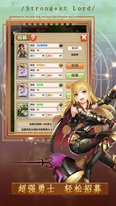 最强领主是一款冒险养成游戏。在游戏中玩家将组建自己的领土,拥有属于自己的领地和军团,带量自己的士兵与其他势力进行冒险战斗,能够获取更多的领地,这样就能让自己的国家继续发展。玩家可以招募几位英雄角色辅助自己战斗,每个英雄技能属性是不同的,在战场内可以更好的辅助军队进行战斗,尽可能获取更多的胜利。