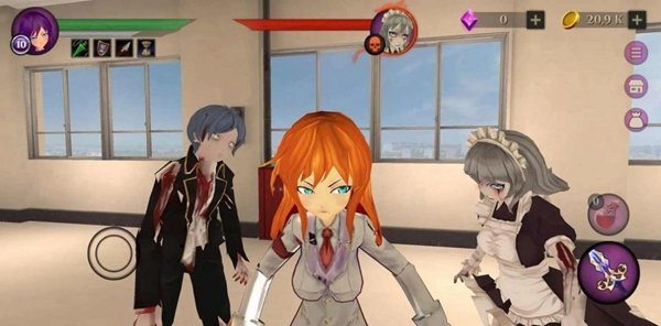 灵活操控自己的少女角色,在校园中探索冒险,对抗僵尸。