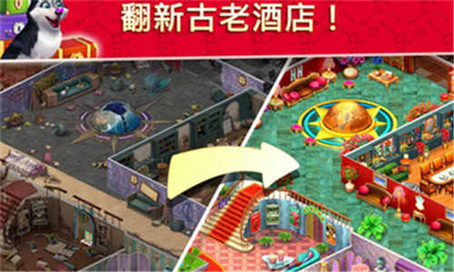 1、完成炫目多彩的2重匹配关卡,通过选择你标志风格的内饰,翻新和装饰酒店;