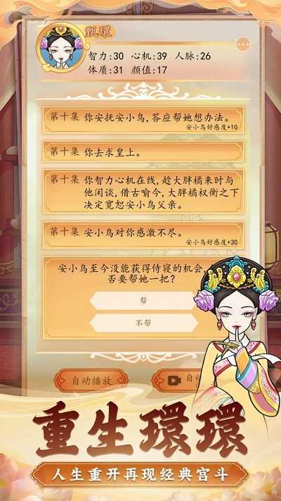 后宫人生模拟器是一款后宫文字模拟、角色扮演类型的游戏。玩家需要在游戏中进行各种决策,包括管理后宫、制定政策、进行战争等等。在后宫中,玩家需要与宫女们进行互动,包括送礼、交谈、赏赐等等。玩家的决策将影响后宫中宫女们的情感状态,最终影响玩家的统治成果。