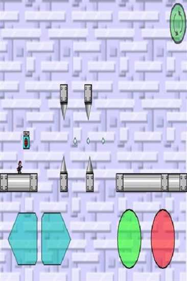 3、开始控制角色往前吧,记得避开尖锐的障碍,绿色按钮连续点击两下可以实现空中两段跳,就能轻松跨越大坑。