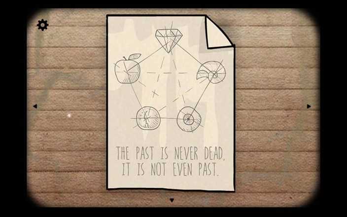 墙上的柜子是上锁的,无法打开,接下来继续往左边看。一眼就看到了窗沿上透露出来的白纸痕迹,收集以后打开看,是一个布阵图(???),其中就包括眼珠,还要贝壳、宝石、苹果和硬币。就这样,游戏开始变得有意思了。