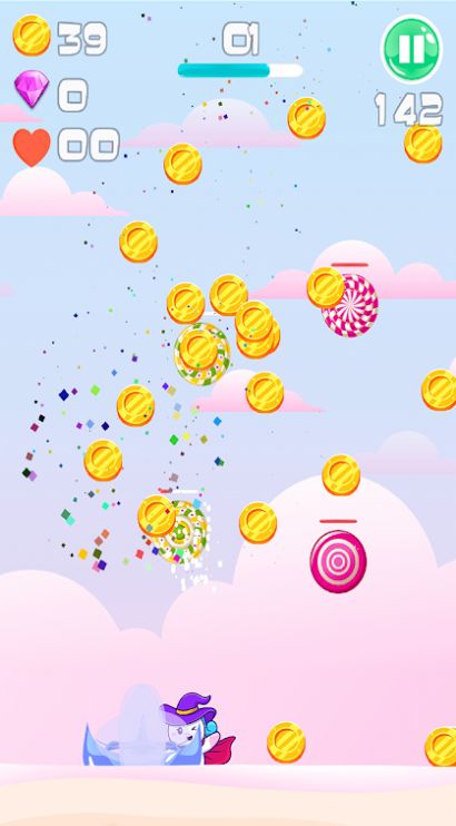 3、控制着手中可爱的独角兽去进行闯关,大量的金币等待着你去收集。