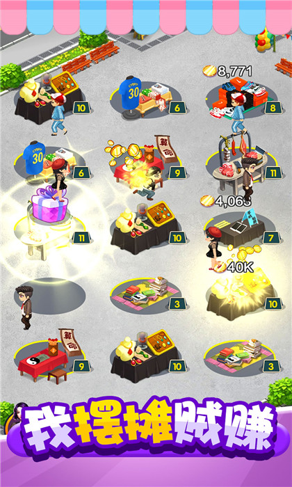 轻松有趣的经营小游戏,玩家可以在游戏中尽情的感受到摆摊的乐趣,不断的积累金币扩大自己的店铺。