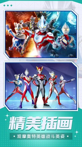 1、奥特曼主题,游戏以奥特曼为背景,各种各样的奥特曼角色和场景为游戏增添了美丽和趣味。