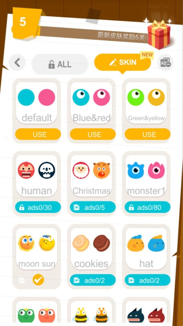 1、不是一个关卡解锁一个新皮肤,皮肤虽然很多,但是需要连过几关。
