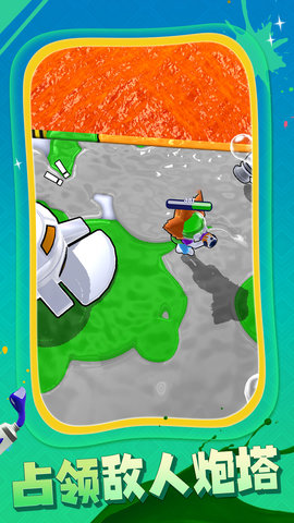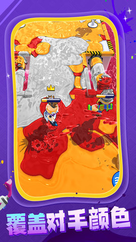 1、游戏以颜料喷射为核心玩法,玩家需要使用手指滑动屏幕来控制小人的移动和喷射方向,给对手喷射颜料,同时要躲避对手的攻击。