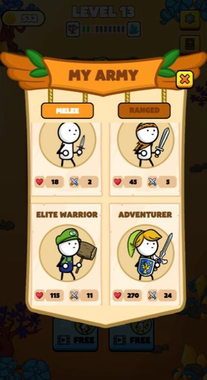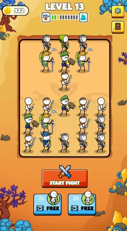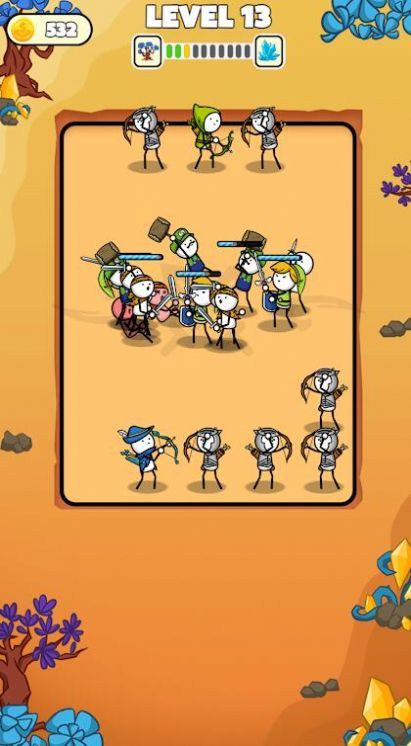 1、玩家将不断合成火柴士兵,创建更强大的火柴士兵、