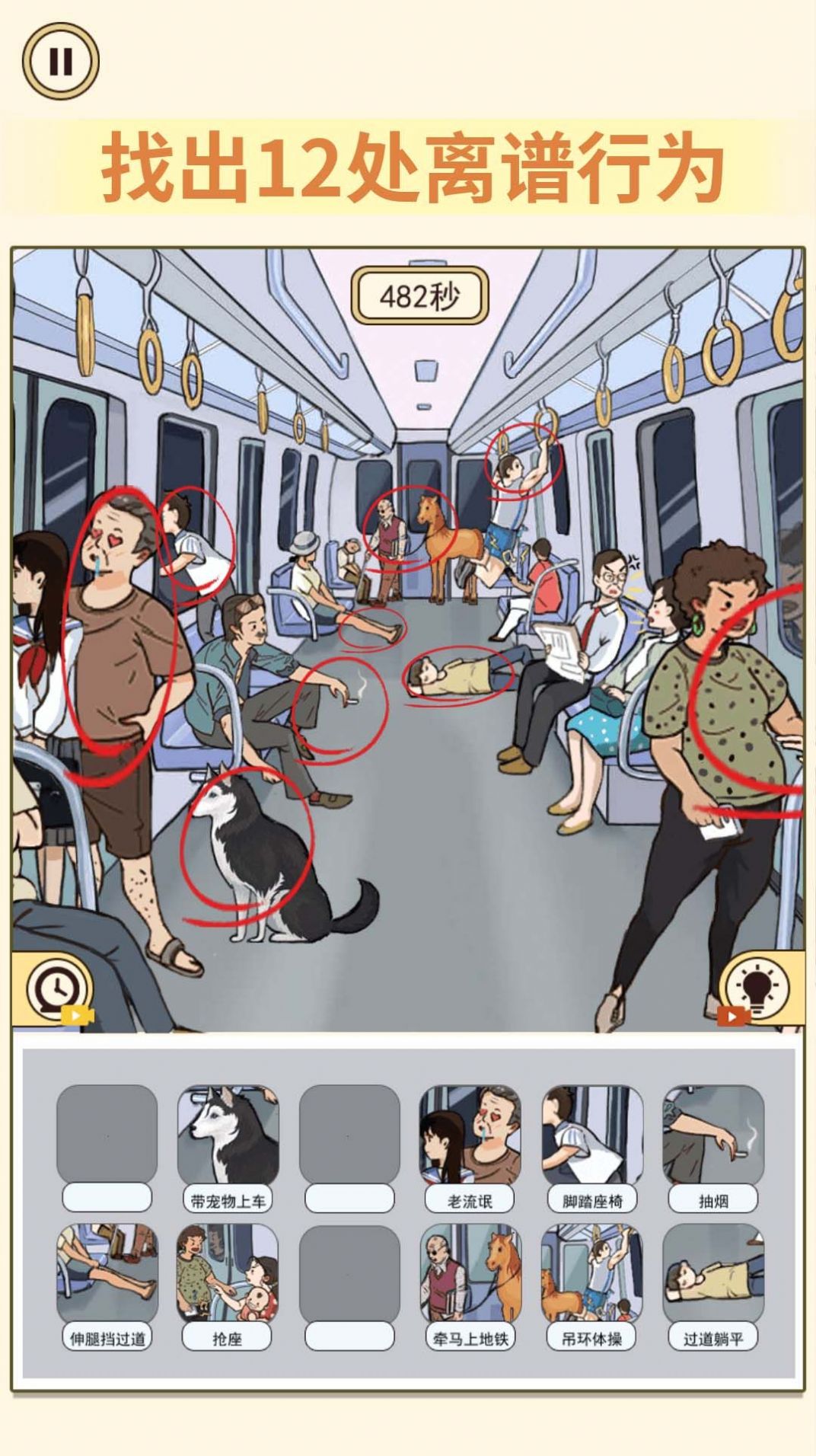 1、在游戏中需要仔细观察画面中的差异和不文明行为,找出所有的茬。