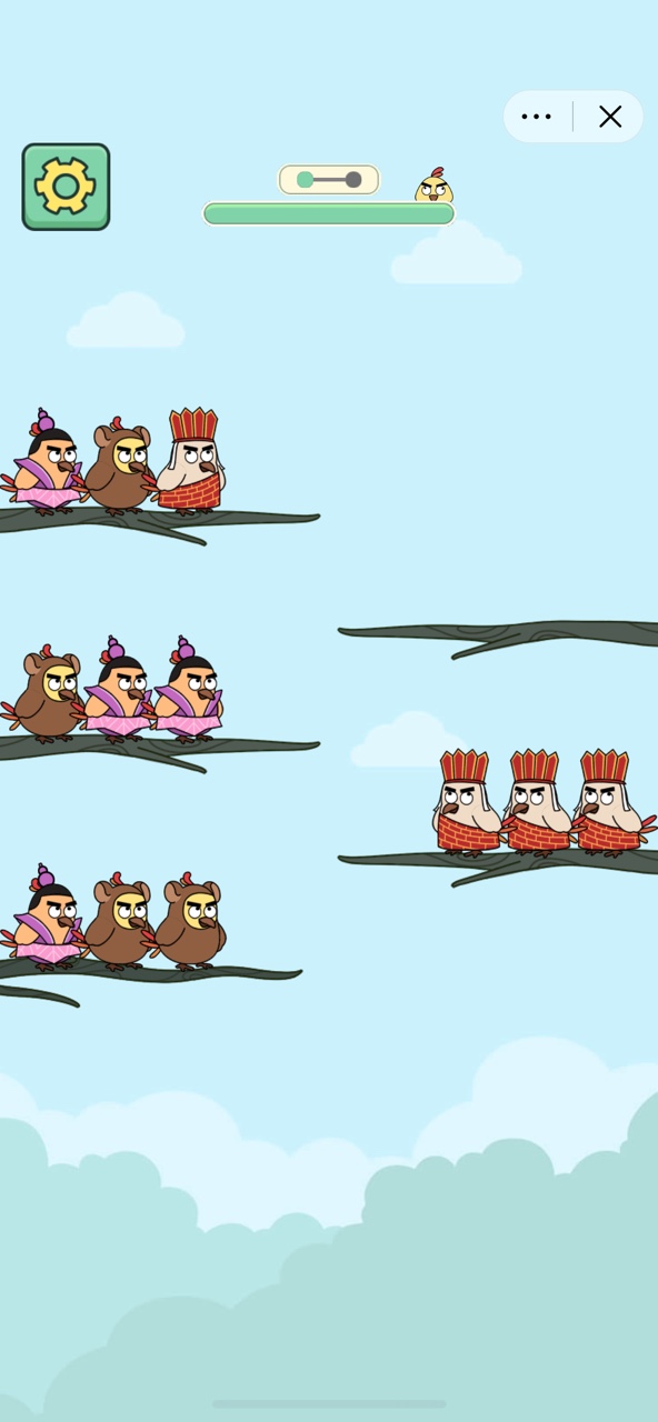 相同颜色的小鸟就可以消除了,游戏采用连线消除的玩法,