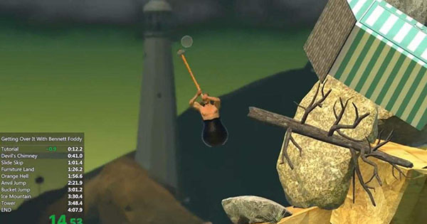 1、玩家控制一个坐在似乎是缸里的人,用一把榔头不断往上爬,操作极其简单;