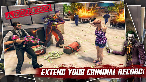 小丑侠盗城拥有着高自由度的玩法,玩家们将会置身与一个罪恶之城内,这里有有着极为丰富的任务在等待着你,每完成一次任务之后,你都能够得到丰富的报酬,依靠自身能力来扩大自己的势力,并最终成为这座城市之中黑帮之王,但是也要小心警察的追捕,毕竟警察还是很强大的,快来下载游戏体验吧。
