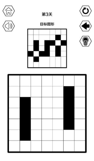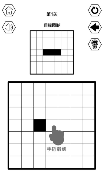使用手指滑动方块,经过的地方将反色(原来是黑色将变为白色,原来是白色将变为黑色),滑动路径不能断,不能交叉,最终画出目标图形则获胜。