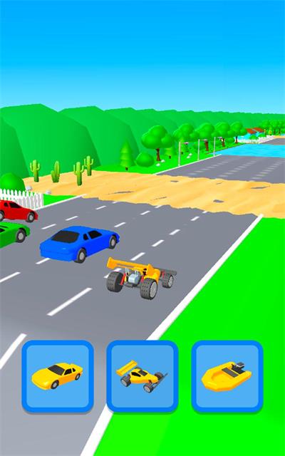 形状变换比赛是一款非常好玩的手机趣味竞速游戏,这款游戏的玩法非常的趣味,玩家们要在游戏当中控制各种的竞速工具来进行比赛,你的竞速工具能够在游戏当中进行各种的变形挑战,非常的好玩有趣,游戏拥有各种不同的赛道,需要玩家们变形为对应的交通工具,非常的具有挑战性,赶快下载吧。