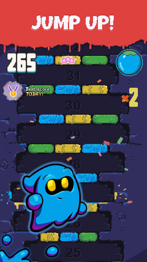 粘液幽灵是一款比较休闲的向上跳跃类游戏,你将控制一个可爱的幽灵竭尽全力向上跳跃,在地牢中展开刺激的冒险,你根本不知道上面会有什么可怕的东西,只能不断地向上跳跃,灵活躲避各种机关,拾取道具来强化自己,努力突破极限刷新纪录。