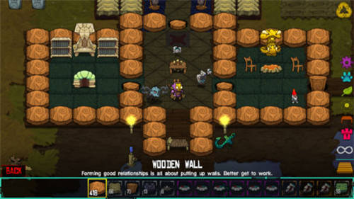 3、右下角的锤子图标就是打开建造模式,选中之后,地图可以建造的空地上放置地板。地板放好之后,可以打造摆设放在上面