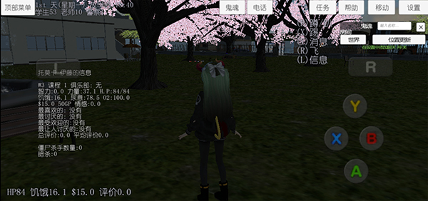 玩法:很普通的玩法,无僵尸模式,照着课表上课,吃东西,上社团活动,加入或退出社团,和学生老师互动,攻略学生并和学生恋爱,爬山玩水,開車,等…….。