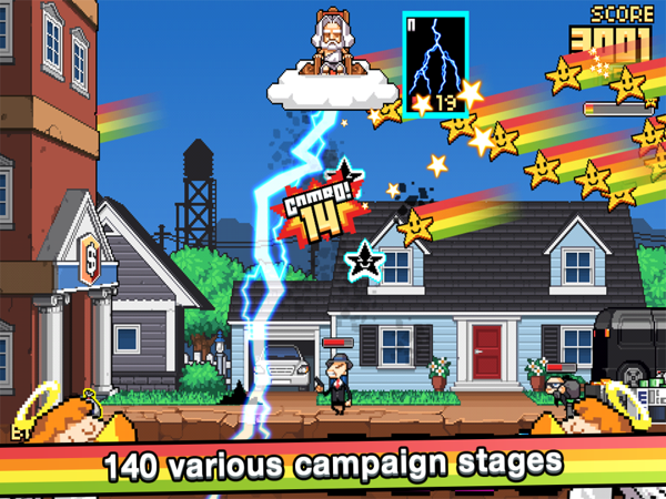 《上帝的惩罚2God Strike 2》是由Magic Cube公司制作并发行的,游戏基本上延续了前作的风格,街机风格的2D画面,其中还带有一些像素元素,闪电效果也是非常夸张,也是为了更加爽快的惩罚那些坏蛋。