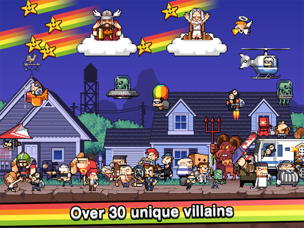 游戏的音乐节奏比较轻快,听起来让人神清气爽。游戏当中准备了多种人物供玩家选择,从雷神到上帝,每一个人物都有一个专属的技能,利用专属技能可以更快的清除屏幕中的恶霸们。