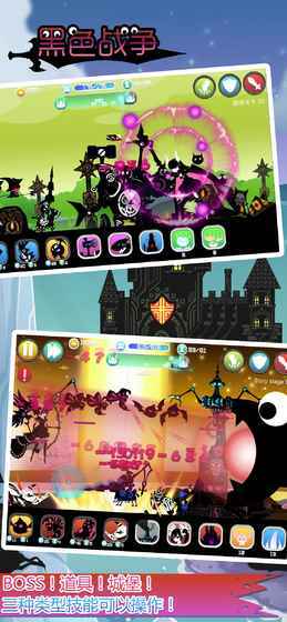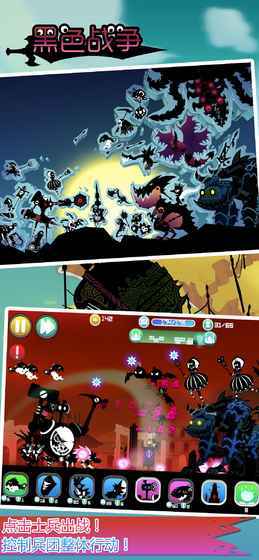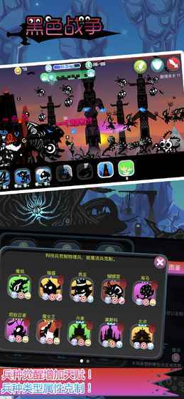 黑色战争是一款画风新奇的单机游戏,魔性上瘾的玩法,丰富的兵种可供玩家选择,轻松的点击方式,上手简单,城堡和兵种做了种族属性天赋,以及类型克制两大属性元素,非常多有趣的设定,感兴趣的朋友不妨快来下载吧!
