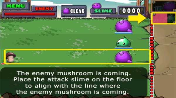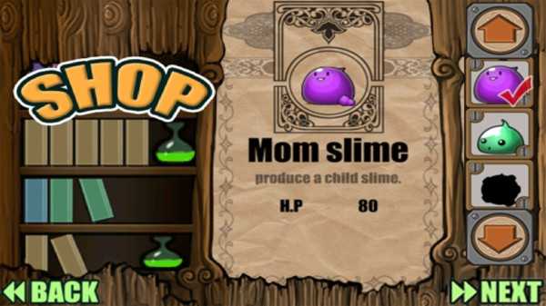 游戏最初只有两种最基本的史莱姆,当赚取一定的金币之后可以购买更具攻击力的强大史莱姆。具有攻击性强大的史莱姆任务是使用各种武器攻击敌人。