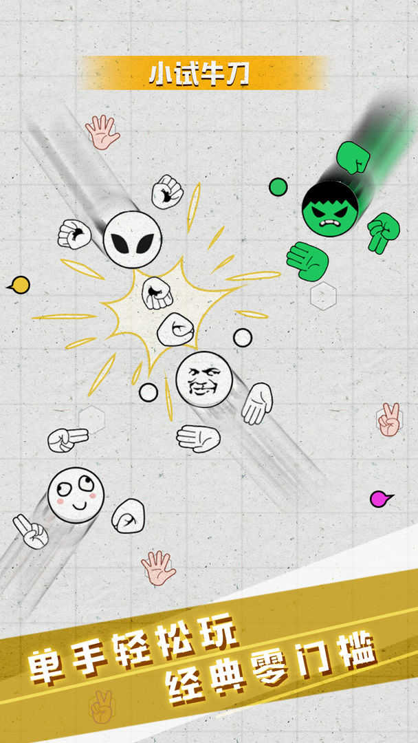还记得的石头剪刀布吗?你是否厌烦成人世界的复杂游戏,怀念起童年?一款能让你分分钟回到小屁孩童年的游戏来了!《猜拳吧小老弟》是史上最逗比的石头剪刀布,浑身布满石头、剪刀、布,有策略的撞击他人。游戏中你只需单手操作便能秀翻全场勇夺第一,别的不多说了,叫上你的小老弟一起来猜拳吧!