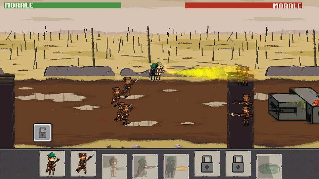 战争部队1917是一款像素风格的策略类战争游戏。游戏背景设定在第一次世界大战期间,玩家需要率领自己的部队,与敌人进行战斗。玩家需要在战争中掌握策略,发现敌人的弱点并利用它们来获得胜利。游戏的画面精美,游戏玩法有趣,并且游戏很容易上手,但是难度也足够高。