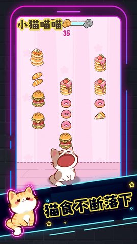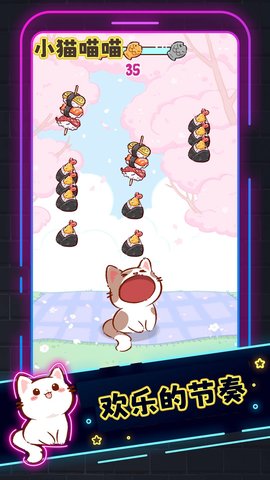 2、玩家需要控制猫喵来捕捉屏幕上不断掉落的音符和食物