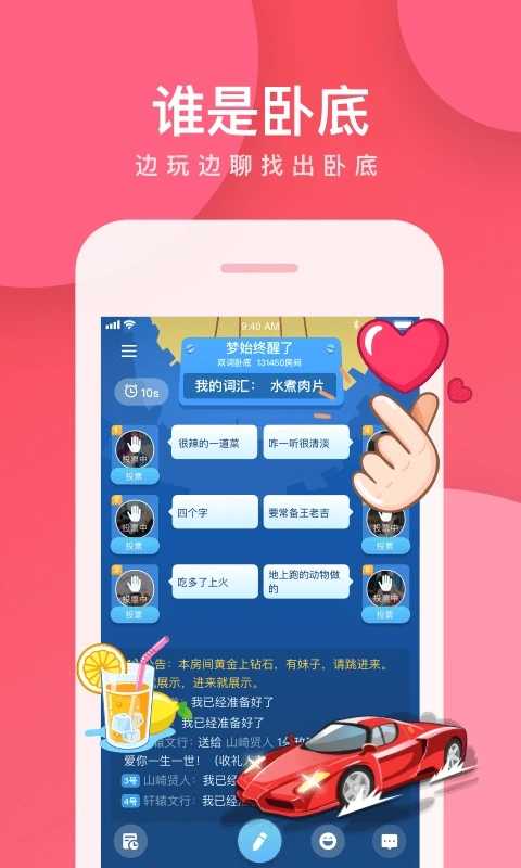 所有玩家需要根据自己的角色身份进行言语和行动,试图揭示卧底的真实身份。
