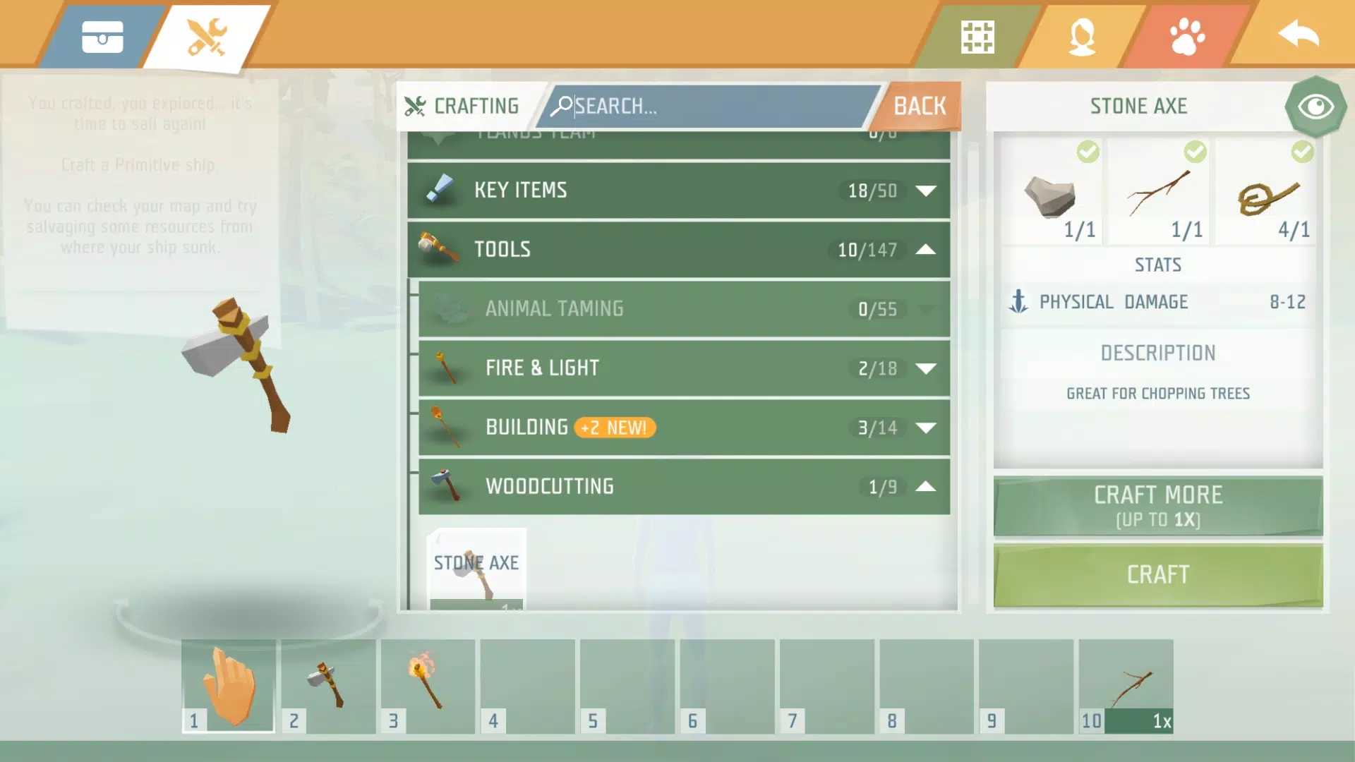 3、最重要的是对于工具的制作,在刚进入游戏的时候,就需要用木材来制作一把斧头,找到一根棍子一块石头,然后找到制作绳子的三根草就能够。制作起一把能够去进行攻击的斧子,有了武器之后,玩家的生存几率就会大大升高。因为有了斧子之后,玩家就可以去砍伐树木,砍了树之后就可以引燃火,有了火之后很多事情都可以去做了,还可以烤水果做吃的,总而言之,玩家开局就需要一把斧头,才能够保证在岛屿上的生存。