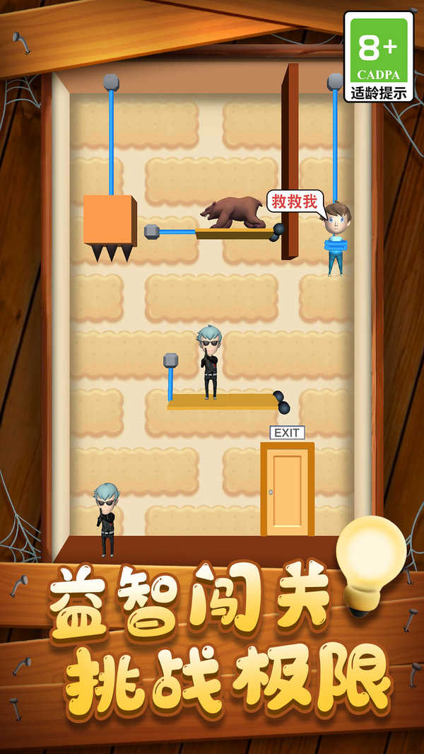 2、面对游戏的谜题,有神奇的解法,培养自己的思维能力,传统的解决各种问题的方式帮助小兄弟们顺利过关。