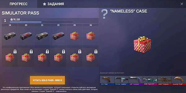1、进入对峙2开箱模拟器游戏之后,我们在左侧可以看到一列导航菜单栏,第一栏右侧有模拟通行证入口。