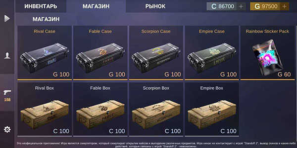 对峙2开箱模拟器是一款模拟开箱手游,玩家可以通过模拟开箱的方式获得虚拟物品。在收集到的虚拟物品中,部分物品还可以进行交易,从而获得更多的游戏资源。游戏加入了出售系统,你可以将抽到的重复武器敲掉奥秘,进行卖出,十分的有意思哦。
